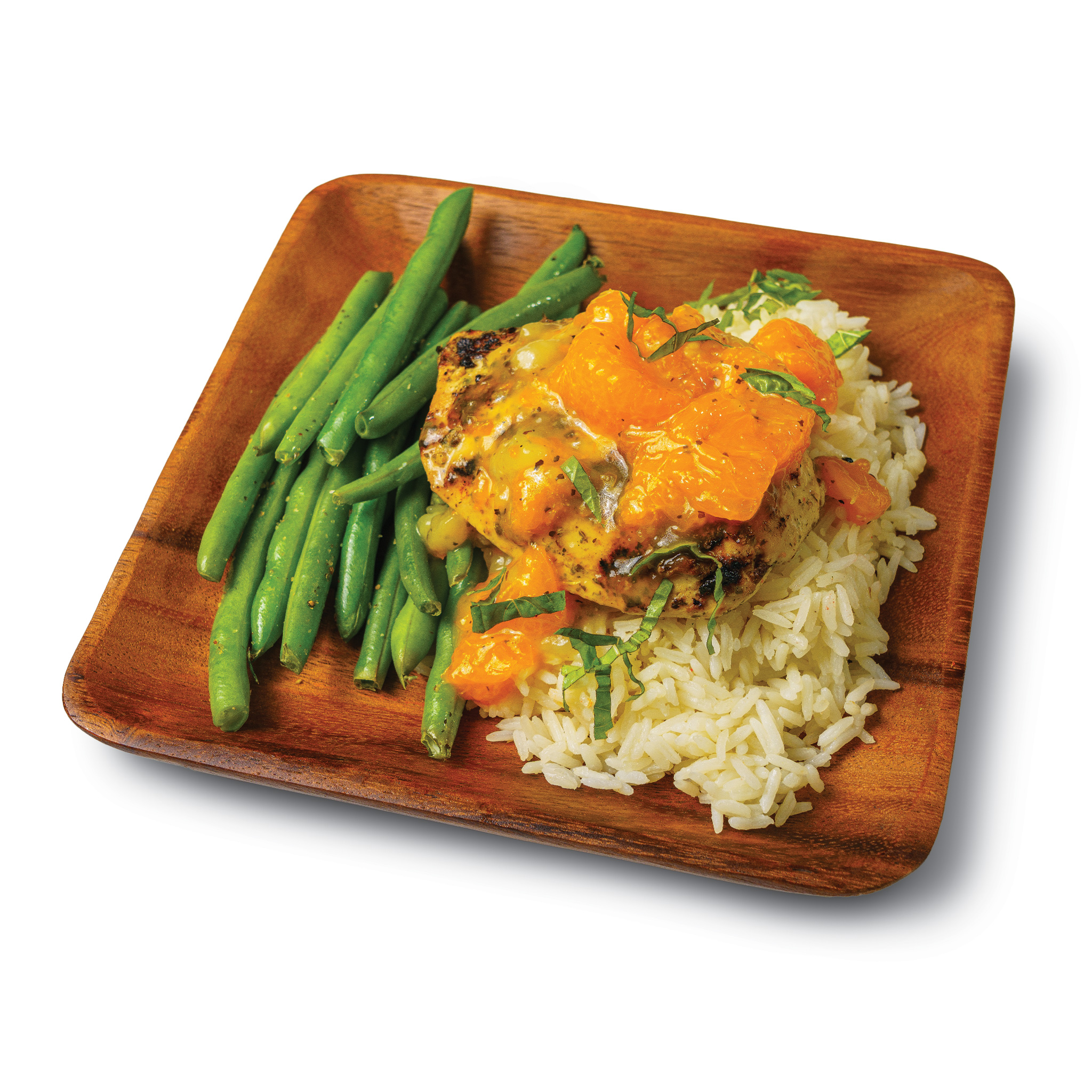 Flavorful, vibrant & succulent - this Orange Chicken with Rice served will have you drooling for more. Enjoy a grilled chicken breast bathed in a zesty orange glaze complemented with jasmine rice and crisp green beans for the ultimate memorable lunch or dinner meal.